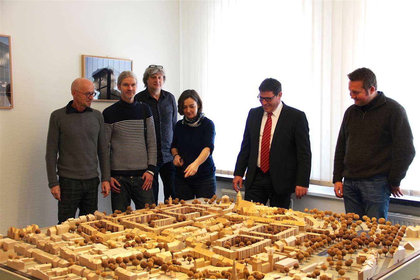 (V.l.n.r., Foto: Pressestelle) Bernau vor Augen: Walter Bitzer (ews Stadtplanung), Modellbauer Henrik Hilsbos und Detlef Jacobi, Amtsleiterin Sylvia Hirschfeld (Stadtplanungsamt), Bürgermeister André Stahl und Christian Filter (Stadtplanungsamt).