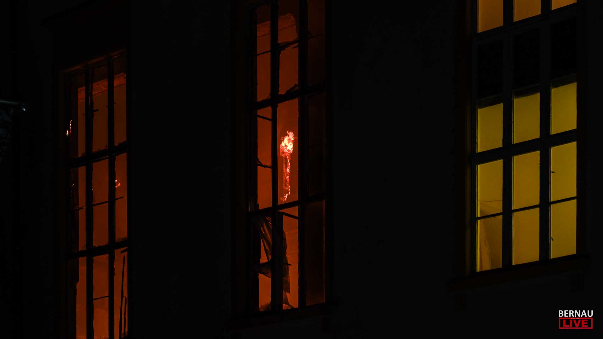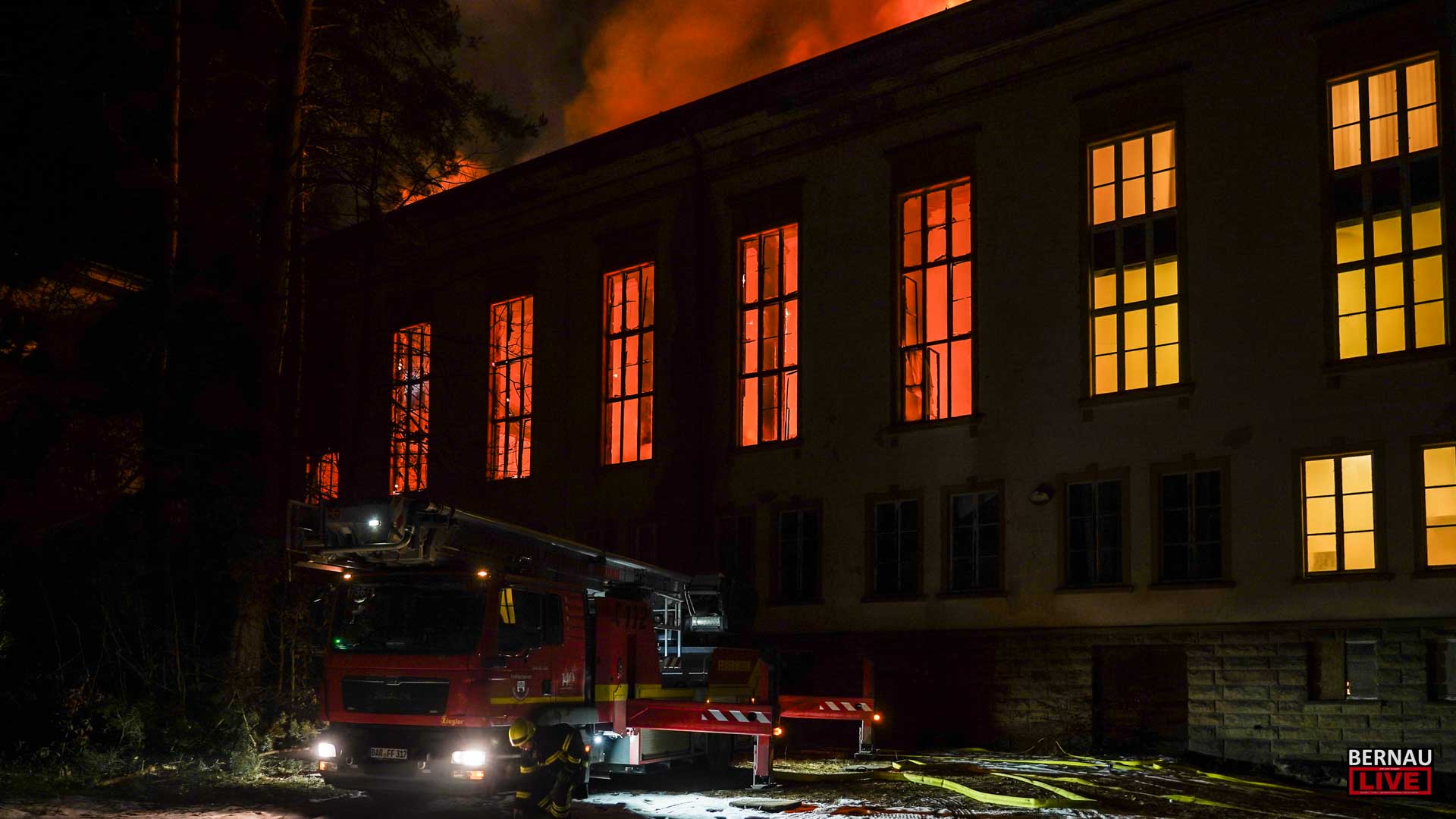 Die Lage auf dem Bogensee-Areal hat sich um Mitternacht dramatisch zugespitzt. Der gesamte Mittelteil des Hauptgebäudes steht mittlerweile in Vollbrand. Die Flammen haben den großen Saal, die Bühne sowie die ehemaligen Sprecherkabinen vollständig erfasst. Trotz eines massiven Aufgebots an Einsatzkräften erweisen sich die Löschwasserreserven angesichts der enormen Brandintensität als unzureichend. Das Feuer schlägt ungehindert vom Erdgeschoss bis durch den Dachstuhl. Ein Stück Geschichte verbrennt – man ist den Tränen nahe!