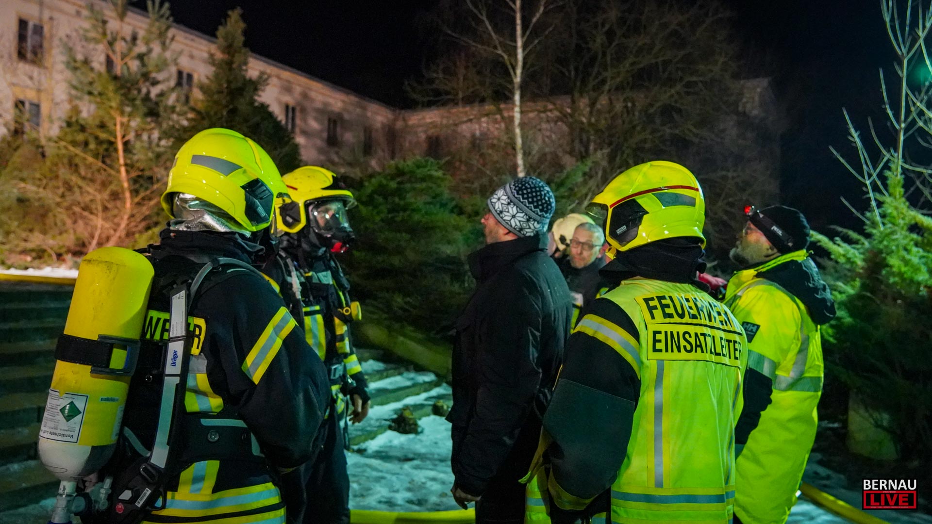 Neben der mangelhaften Wasserversorgung auf dem weitläufigen Gelände erschweren die Witterungsbedingungen die Löscharbeiten massiv. Bei Temperaturen um –7 Grad gefriert das Löschwasser sofort auf dem Boden. Das gesamte Areal rund um das brennende Gebäude hat sich in eine gefährliche Eisfläche verwandelt, die jeden Schritt der Einsatzkräfte zur Gefahr macht.