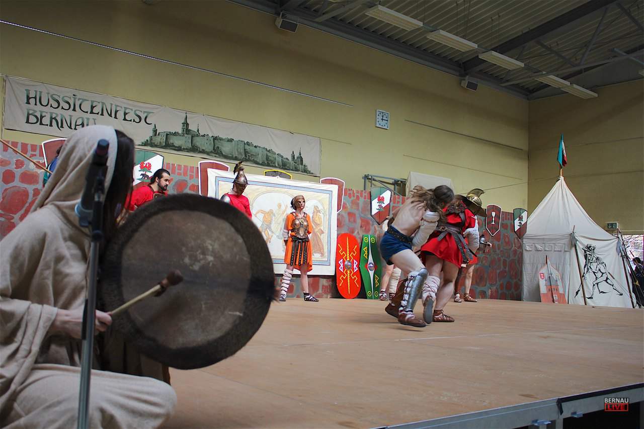Wo sonst der Sport im Mittelpunkt steht, versammeln sich am heutigen Sonntag mehr als 150 Teilnehmer aus zahlreichen Vereinen und Gruppen in authentischen Kostümen und Waffen und bieten den Besuchern noch bis etwa 17 Uhr, ein spektakuläres Programm in der Hussitenstadt Bernau.
