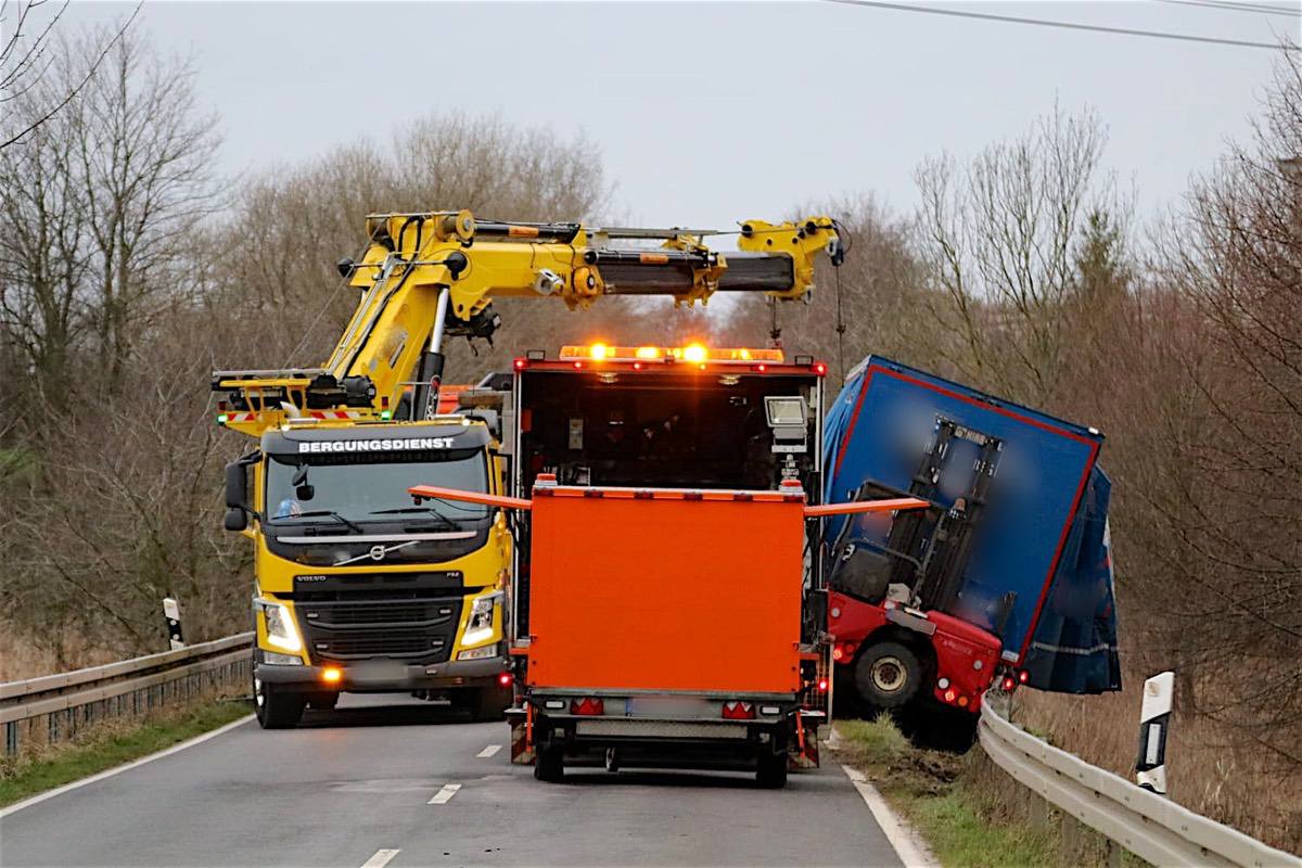 Da der LKW sich nicht selbst aus der Schräglage befreien konnte, wurde ein Spezialkran angefordert. Dieser wird versuchen, den LKW zu entladen und aus der misslichen Situation zu ziehen. Da über der „Unfallstelle“ Stromleitungen verlaufen, gestaltet sich die Bergung des LKW´s als schwierig. Die Arbeiten sind im Augenblick (17.30 Uhr) in vollem Gange und die Straße vorerst weiterhin voll gesperrt.