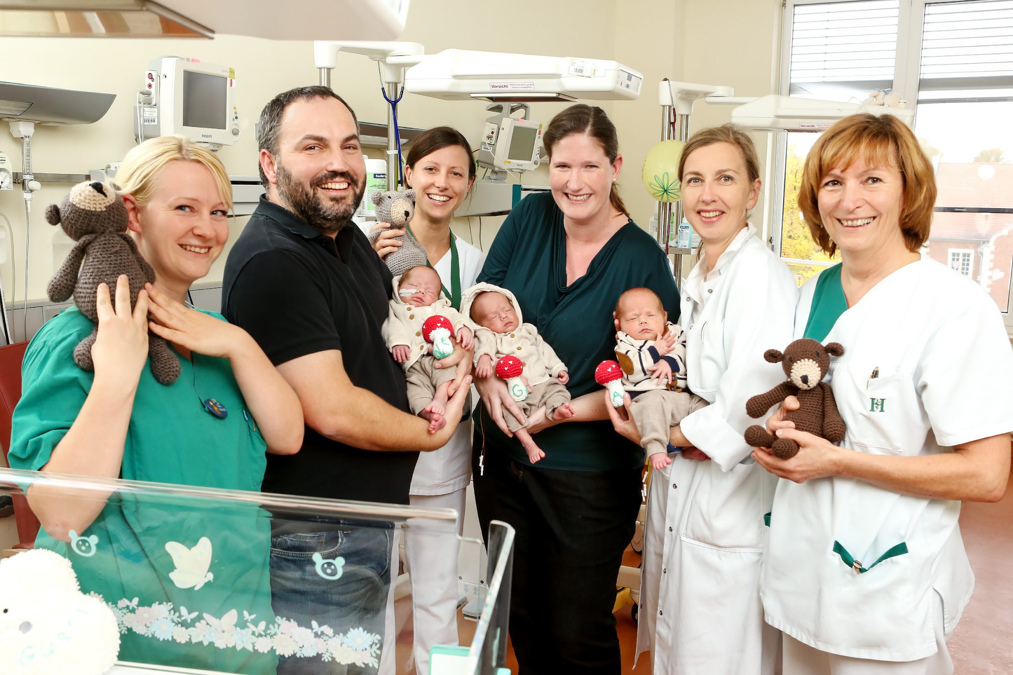 Bei der Kontrolluntersuchung von Jette B. (31, Lehrerin) in der 10. Schwangerschaftswoche war klar: Die eineiigen Zwillinge haben noch ein Geschwisterchen. Mit ihrem Mann Dirk B. (41, Polizist) wohnt sie in Petershagen bei Strausberg. Beide arbeiten in Berlin. Zur Betreuung und Entbindung entschieden sie sich für das HELIOS Klinikum Berlin-Buch, denn auch die Drillinge aus ihrem Nachbarort Fredersdorf – Matts, Jette und Senta – wurden im März des Jahres in Buch geboren.