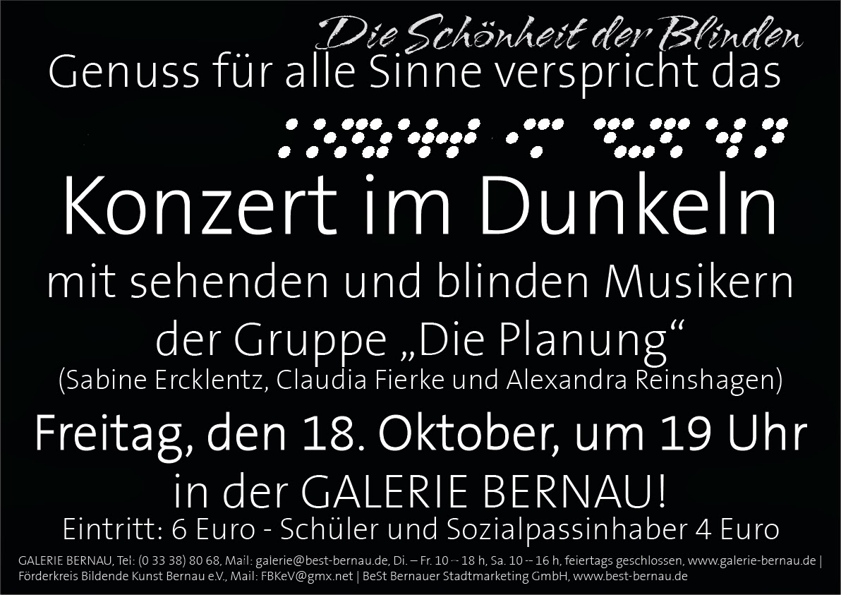 Anlässlich der Ausstellung „Karsten Hein – Die Schönheit der Blinden“ in Bernau haben sich die drei Musikerinnen Sabine Ercklentz, Claudia Fierke und Alexandra Reinshagen zusammengefunden und wagen unter dem Namen „Die Planung“ das Experiment zum ersten Mal im Dunkeln und zusammen vor Publikum zu spielen. Ein unvergessliches Erlebnis für Künstlerinnen und Publikum!