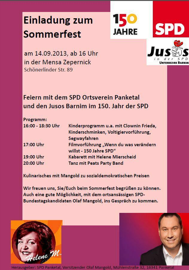 Der SPD-Ortsverein Panketal und die Jusos Barnim laden herzlich zur gemeinsamen Feier am Samstag, den 14. September 2013 ab 16 Uhr in und an der Schul-Mensa Zepernick, Schönerlinder Str. 89 ein.